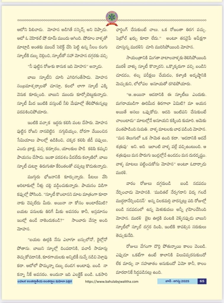 ఆ రోజు మోహన పుట్టిన రోజు. పొద్దున్నే లేచి తయారై, బాబుతో సహా అమ్మవారిగుడికి వెళ్లారు. తర్వాత నేరుగా ఇంటికి కాకుండా, ఓ చోటుకు తీసుకుపోతాను అంటూ మురళి ఆటోని పిలిచాడు. మోహన అడిగితే సస్పెన్స్ అని చెప్పాడు. ఆటో ఓ వెహికల్ షో రూమ్ ముందు ఆగింది. షోరూం వాళ్ళతో మాట్లాడి అంతకు ముందే సెలెక్ట్ చేసి పెట్టి ఉన్న నీలం రంగు స్కూటీకి డబ్బు చెల్లించి, స్కూటీతో సహా మోహన దగ్గరకు వచ్చి