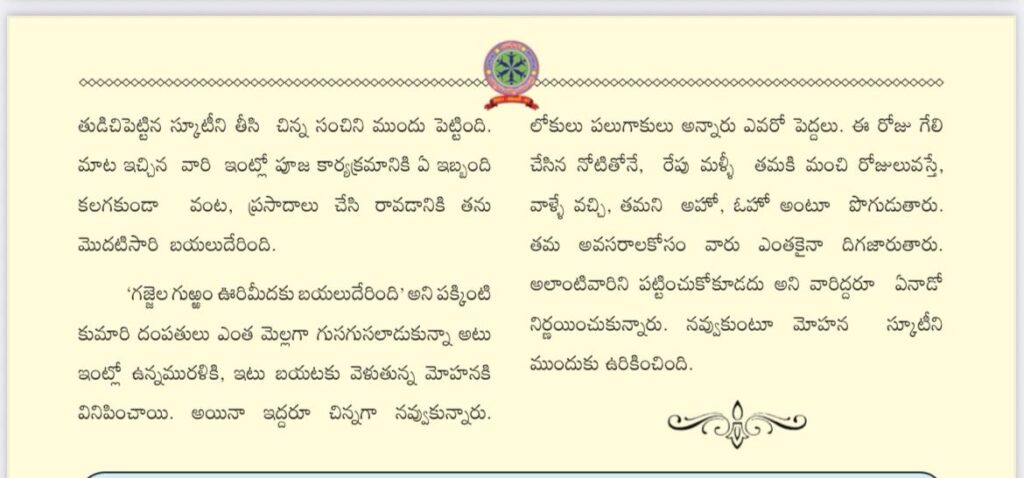 ‘గజ్జెల గుఱ్ఱం ఊరిమీదకు బయలుదేరింది’ అని పక్కింటి కుమారి దంపతులు ఎంత మెల్లగా గుసగుసలాడుకున్నా అటు ఇంట్లో ఉన్నమురళికి, ఇటు బయటకు వెళుతున్న మోహనకి వినిపించాయి. అయినా ఇద్దరూ చిన్నగా నవ్వుకున్నారు. లోకులు పలుగాకులు అన్నారు ఎవరో పెద్దలు. ఈ రోజు గేలి చేసిన నోటితోనే, రేపు మళ్ళీ తమకి మంచి రోజులువస్తే, వాళ్ళే వచ్చి, తమని అహో, ఓహో అంటూ పొగుడుతారు. తమ అవసరాలకోసం వారు ఎంతకైనా దిగజారుతారు. అలాంటివారిని పట్టించుకోకూడదు అని వారిద్దరూ ఏనాడో నిర్ణయించుకున్నారు. నవ్వుకుంటూ మోహన స్కూటీని ముందుకు ఉరికించింది.