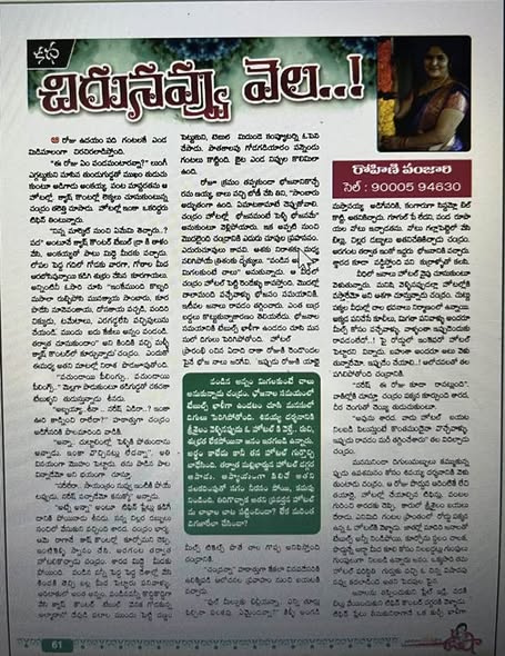 మార్చి నెల “ఉషా మాసపత్రిక” ఉగాది ప్రత్యేక సంచిక లో నా కథ ” చిరునవ్వు వెల..!” కథ చదవండి. మీ అమూల్యమైన అభిప్రాయాలు తెలుపండి