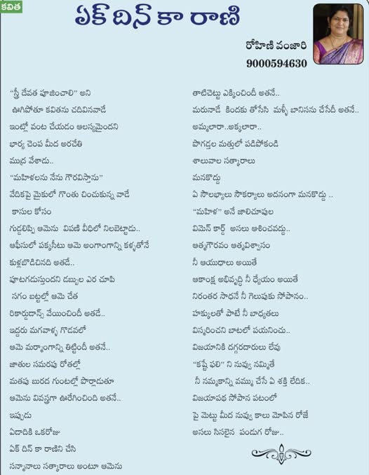 “ఏక్ దిన్ కా రాణి” బహుళ త్రైమాసిక ఆన్లైన్ పత్రిక “మహిళ దినోత్సవ ప్రత్యేక సంచిక లో ప్రచురితం అయిన నా కవిత చదవండి